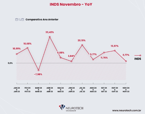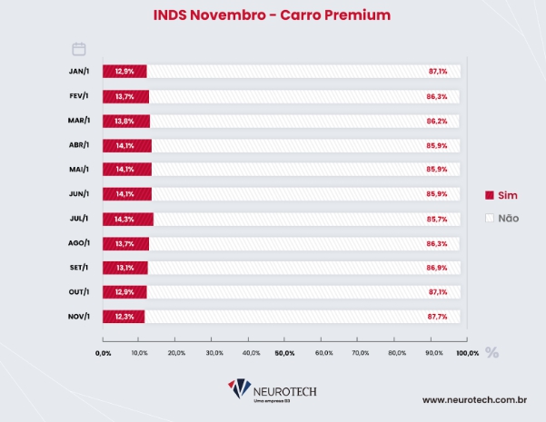 A demanda do mercado brasileiro de seguros de automóveis aumentou apenas 0,77% em novembro, em comparação com o mesmo mês de 2023. Já na comparação com o mês anterior, outubro de 2024, o cenário foi de queda, com um recuo de 12,49%. Os dados são do Índice Neurotech de Demanda por Seguros (INDS), que mede mensalmente o comportamento e o volume das consultas na plataforma da Neurotech, empresa pioneira em soluções de inteligência artificial aplicadas a seguros e crédito.