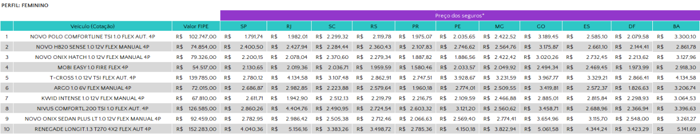 1. O Novo Polo Comfortline se mantém em primeiro na lista dos mais vendidos, registrando a maior queda em ambos os perfis. No masculino, o modelo atinge o valor médio do seguro de R$ 4.176,56 (-7%). Já no feminino, o preço médio é de R$ 2.343,67 (-17,3%).