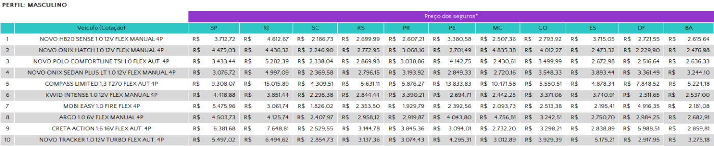 As cotações mencionadas no texto são as de menor valor dentro dos perfis cotados com as seguradoras.