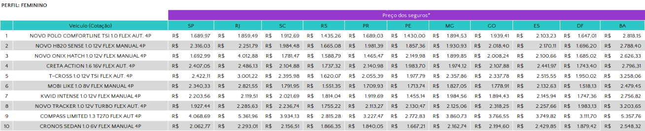 As cotações mencionadas no texto são as de menor valor dentro dos perfis cotados com as seguradoras.