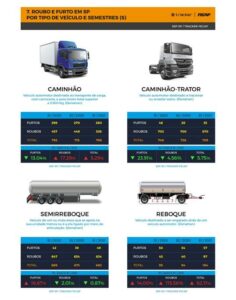 O estudo analisou os quatro tipos de veículos separadamente. A quantidade de roubos e furtos de reboques, até junho de 2021 (154 ocorrências), já se aproxima do patamar dos acumulados de 2019 (212 registros) e do ano passado (189 ocorrências). E a quantidade de roubos de caminhões, nos seis meses de 2021, já representa 53,97% do registrado em todo ano de 2020.