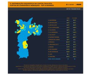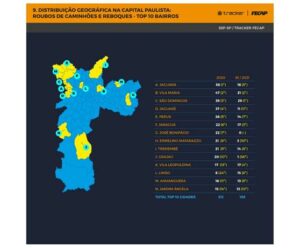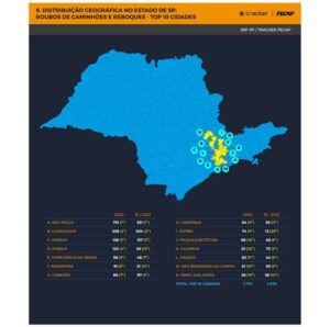 Os municípios de Cubatão, Cajamar, Itaquaquecetuba, Osasco, São Bernardo do Campo e Embu das Artes subiram no ranking e se destacam negativamente em 2021 entre as mais visadas pelos criminosos para roubo. O topo da lista continua ocupado por São Paulo, Guarulhos e Jundiaí. “Em Cajamar, em todo o ano de 2020 foram registrados 33 boletins, enquanto em apenas 6 meses deste ano, já são 72 ocorrências. Uma das hipóteses para esse aumento substancial de roubos é o fato de o município atrair cada vez mais Centros de Distribuição para a região, com incentivo fiscal e por ter acesso privilegiado pela Rodovia Anhanguera e Rodoanel”, afirma o coordenador do Comando de Operações do Grupo Tracker, Vitor Correa.