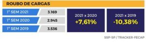 O roubo de cargas nos seis primeiros meses de 2021 cresceu 7,61% em relação ao primeiro semestre do ano anterior. Só no mês de junho foram 493 ocorrências, um aumento significativo de 19,65% em relação a junho de 2020.