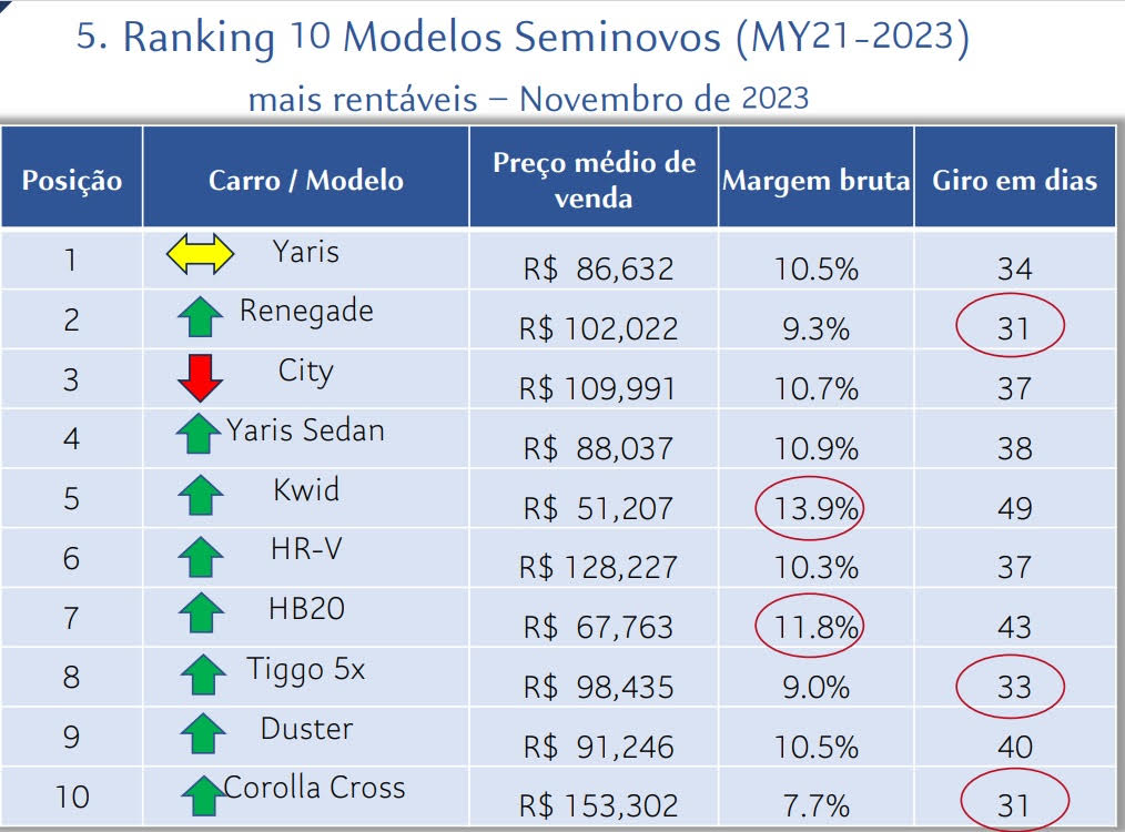 Toyota Yaris ficou em primeiro lugar com margem bruta de 10,5% e giro de 35 dias. O Renegade, por sua vez, teve margem de 9,3% e giro de 31 dias. A terceira posição é do Honda City, com 10,7% e 37 dias. O Tiggo 5X teve margem de 9% e giro de 33 dias. Veja na tabela abaixo a lista completa dos dez veículos mais rentáveis em novembro.