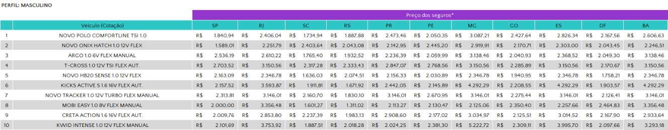 O ranking abrange 11 capitais brasileiras e considera a lista divulgada pela Fenabrave (Federação Nacional da Distribuição de Veículos Automotores) para determinar os dez carros mais vendidos no período. Os números que mostram queda no valor do seguro para o perfil masculino ocorrem pelo segundo ano seguido, quando as apólices registraram queda superior a 21% em março de 2023 e de quase 33% no trimestre.