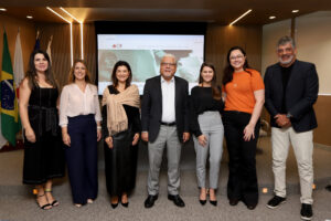 Patrícia Brandão e Janaína Serra (Sabemi), Juliana Queiroz (SulAmérica), João Paulo Moreira de Mello (pres. do CSP-MG), Júlia Costa (Simetria Brasil), Vitória Amaral (Stoa) e Maurício Tadeu Barros Morais (dir. do CSP-MG e mediador do evento)