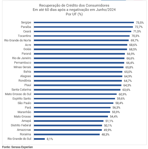No ranking por Unidades Federativas (UFs) do Indicador de Recuperação de Crédito da Serasa Experian, Sergipe conquistou o primeiro lugar, com 73,5% dos encargos vencidos em junho pagos em até 60 dias após o mês de referência. Em seguida ficou Paraíba (72,7%) e Ceará (71,5%). Veja o levantamento completo por estados: