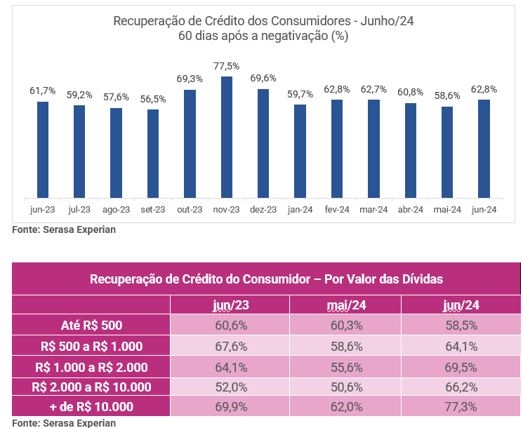 De acordo com o Indicador de Recuperação de Crédito da Serasa Experian, 6 em cada 10 (62,8%) contas negativadas em junho foram regularizadas ou renegociadas por consumidores inadimplentes em até 60 dias após o mês de referência, ou seja, em agosto. Em relação ao valor desses compromissos financeiros, débitos superiores a R$ 10 mil marcaram o maior percentual de quitações (77,3%), enquanto aqueles de até R$ 500 tiveram o menor (58,5%). Veja nos gráficos a seguir a evolução mês a mês e a visão por valor da dívida: