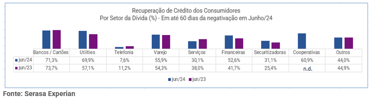 Observando os setores das negativações, é possível identificar que o de “Bancos e Cartões” foi o mais contemplado, já que 71,3% das contas inadimplidas em junho neste segmento foram regularizadas em até 60 dias. Em segundo lugar estava “Utilities”, que engloba contas de luz, água e gás, registrando 69,9% de pagamentos. Confira os dados dos outros segmentos na tabela abaixo: