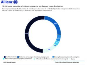· O impacto direto dos sinistros de Covid-19 é limitado. Incidentes como escorregões e quedas nos aeroportos diminuíram, mas as grandes perdas continuam. Espera-se que a atividade de sinistros volte aos níveis normais à medida que os passageiros retomam suas viagens. A análise de sinistros dos últimos cinco anos mostra que os incidentes de colisões/acidentes são a principal causa de perdas.