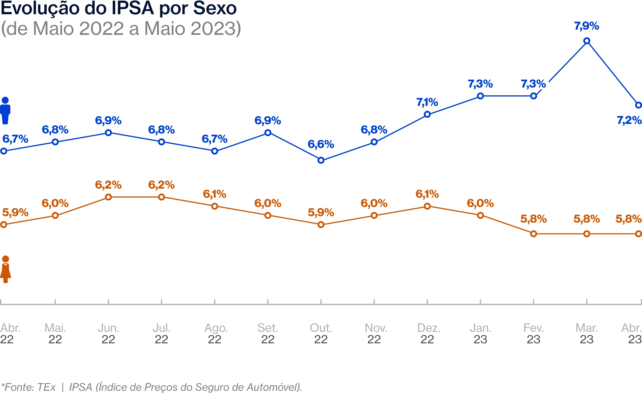 O IPSA de maio apresentou uma queda para o gênero masculino, 8,9%, enquanto para o sexo feminino o índice se manteve estável, em 5,8%. Apesar dessa diminuição da distância entre os sexos, vale destacar que os homens ainda pagam 24,1% a mais que as mulheres.