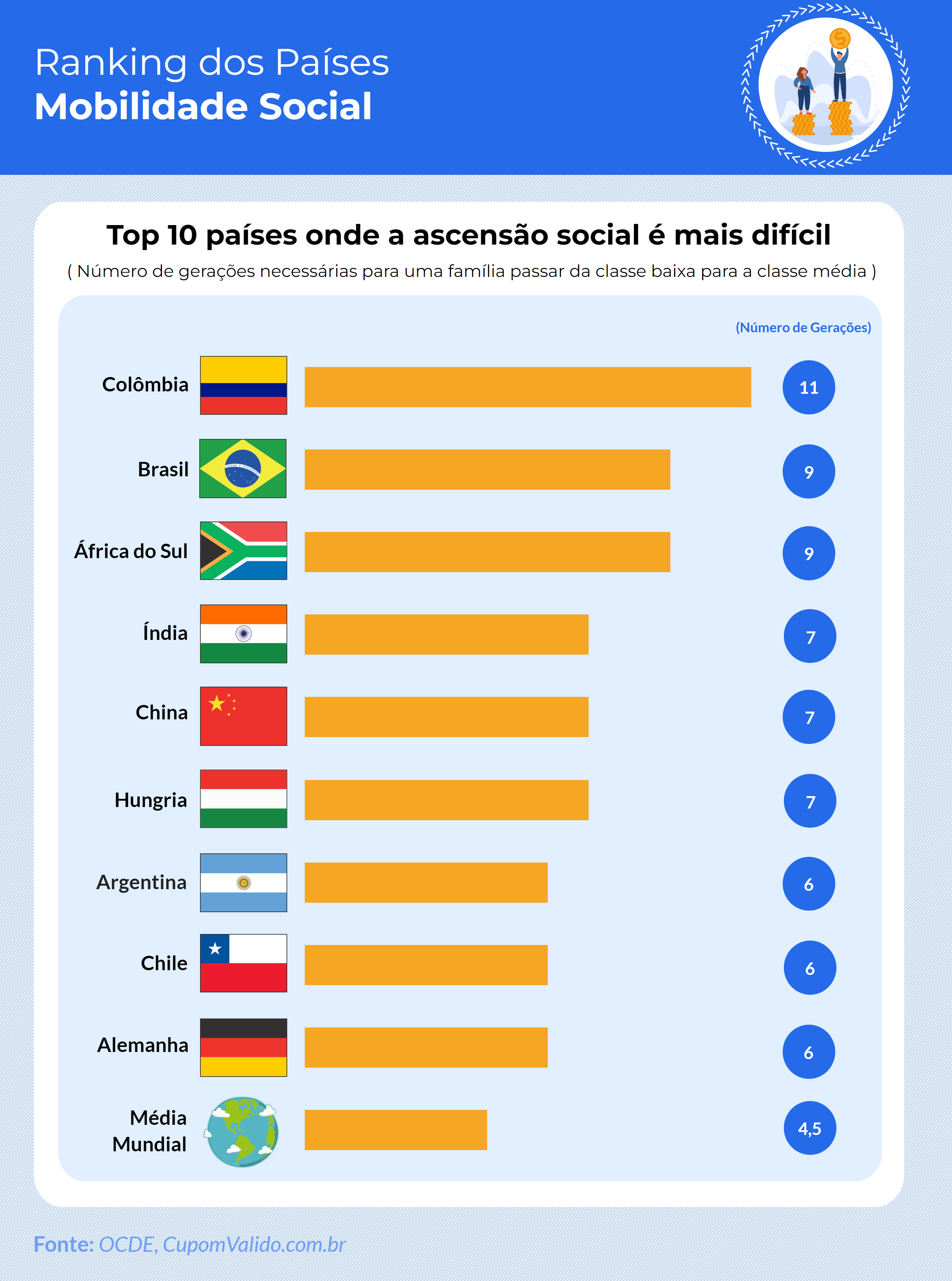É o que revela um estudo divulgado pela plataforma de cupons de desconto CupomValido.com.br com dados da OCDE sobre mobilidade social.