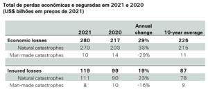 No ano passado, as catástrofes naturais resultaram em uma perda econômica global total de US$ 270 bilhões e perdas seguradas de US$ 111 bilhões — a quarta maior nos registros sigma. O dado mostra tendência contínua de longo prazo de perdas seguradas, aumentando entre 5% e 7% ao ano em todo o mundo. Embora o furacão Ida tenha sido o desastre natural mais caro em 2021, os eventos secundários mais uma vez foram responsáveis pela maioria das perdas seguradas por catástrofes naturais ao longo do ano. A inundação na Europa em julho, por exemplo, foi o desastre natural mais caro já registrado na região. Apesar das perdas seguradas recorde de inundações, a lacuna de proteção global associada continua grande.