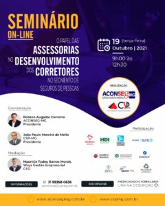 A Associação das Agências, Assessorias e Consultorias de Seguros do Estado de Minas Gerais (Aconseg-MG) e o Clube de Seguros de Pessoas de Minas Gerais (CSP-MG) realizam, no dia 19 de outubro, das 9h às 12h30, um seminário on-line e gratuito para debater o papel das assessorias no desenvolvimento dos corretores no segmento de seguros de pessoas.