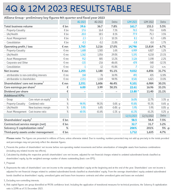 O lucro líquido básico dos acionistas subiu para 9,1 (7) bilhões de euros. Esse aumento se deu graças a um lucro operacional maior no período em curso, bem como a um melhor resultado não-operacional devido à provisão excepcional da AllianzGI US Structured Alpha captada no período do exercício anterior. O lucro líquido atribuível aos acionistas avançou para 8,5 (6,4) bilhões de euros, em uma alta de 33%.