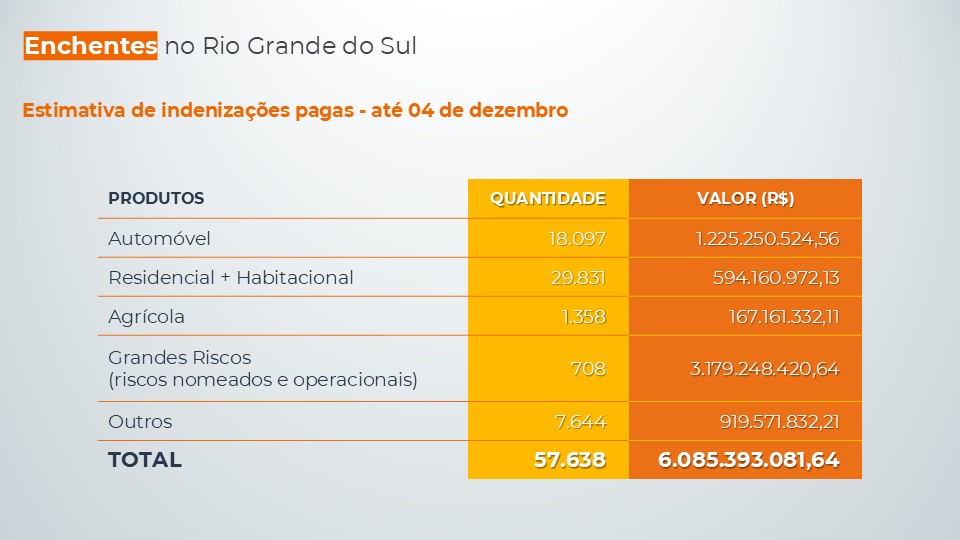 O volume total de pedidos de indenizações de seguros relacionados às enchentes no Rio Grande do Sul totalizou cerca de R$ 6,1 bilhões. Em quantidade, as seguradoras registraram 57.638 avisos de sinistro desde o início de maio, com destaque para os seguros Residencial e Habitacional, que somaram 29.831 avisos, e o Automóvel, com 18.097.