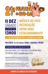 Por causa da pandemia, pela primeira vez em duas décadas, a Feijoada do CVG-RJ não foi realizada, em 2020. Mas agora, com o avanço da vacinação, o evento será retomado com os cuidados necessários: na parte interna do hotel, ainda será obrigatório o uso de máscara, que está dispensada para a área externa, local da Feijoada, seguindo orientação da Prefeitura do Rio.