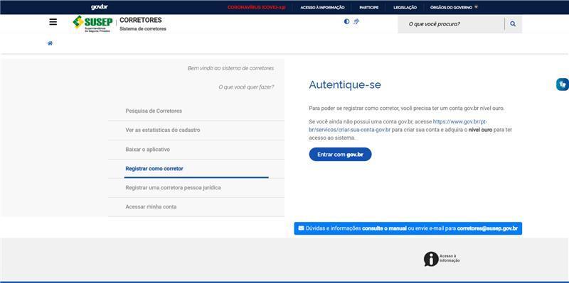 Em breve todos os corretores de seguros já cadastrados deverão possuir uma conta gov.br nível Ouro para efetuar o login. Os corretores recém habilitados já começam a atuar utilizando a conta gov.br, os que já atuam e são cadastrados poderão continuar a utilizar o seu login e senha no sistema antigo por mais seis meses, depois disso o acesso será somente pela conta gov.br. Para saber como criar uma conta gov.br nível ouro clique aqui.