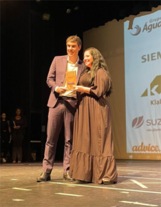 Gustavo Sierra, gerente de Comunicação da Abramge, recebe o troféu Empresas que Melhor se Comunicam com Jornalistas, das mãos da diretora da Ebert Comunicações, Alexandra Ebert.