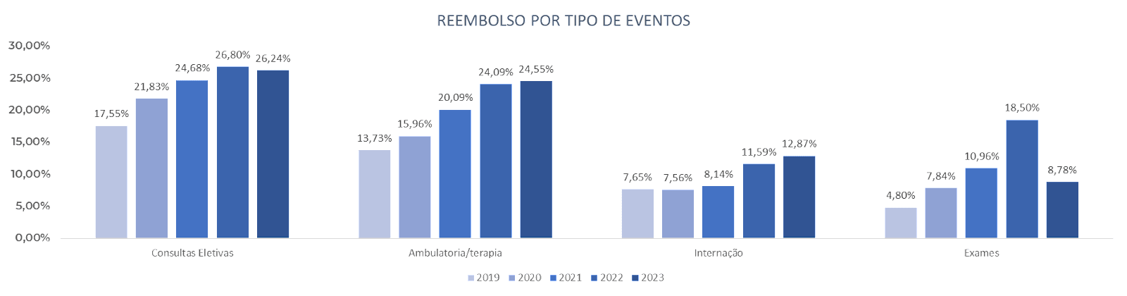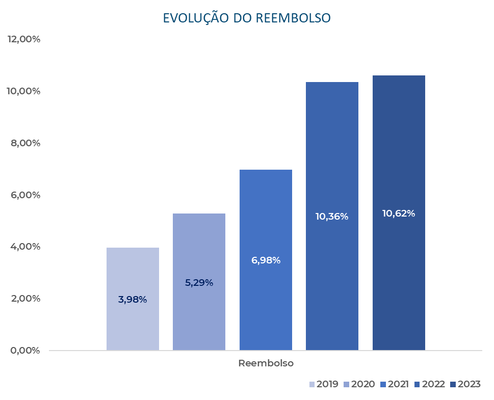 Considerando os dados de 2019 a 2023, a Companhia identificou aumento de 167% em reembolsos em sua carteira