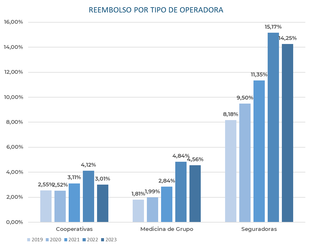 No detalhe, os planos de Cooperativas saíram de 2,55% para 4,12%, em 2023, o que segundo o executivo demonstra linearidade, com menor variação na representatividade do impacto do reembolso durante os anos. Já ao analisar a Medicina em Grupo, houve um aumento de 1,81% para 4,76%, já que algumas redes verticalizadas começaram a ofertar nos planos executivos hospitais com boas tabelas de reembolso para melhorar a concorrência.