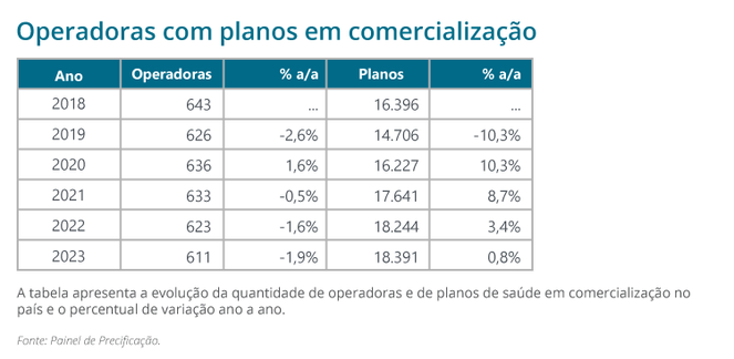 O Painel de Precificação, por sua vez, mostra que, ao fim de 2023, havia 611 operadoras atuando no território nacional, com 18.391 planos de saúde de cobertura médico-hospitalar disponíveis para comercialização em pelo menos um município. A redução do número total de operadoras atuantes no mercado de 623 (2022) para 611dá continuidade à tendência de consolidação do setor, observada desde o início da série histórica.