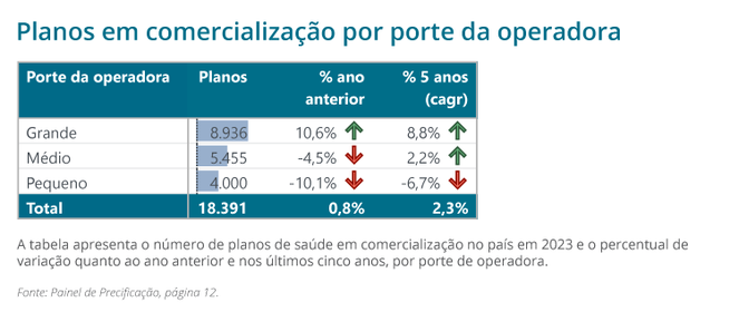 A leitura do painel também possibilita verificar que, de 2019 a 2023, as operadoras de grande porte aumentaram seu volume de planos, na ordem de 8,8%, enquanto os planos de operadoras de pequeno porte tiveram queda de 6,7%.