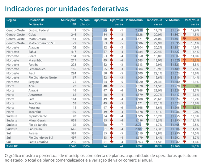 Em termos do volume de planos nas prateleiras das operadoras na média por município, o setor terminou 2023 com 1.692 planos, representando um aumento de 18,1% em relação a 2022. Esse aumento se observou na média dos municípios de todas as unidades da federação.
