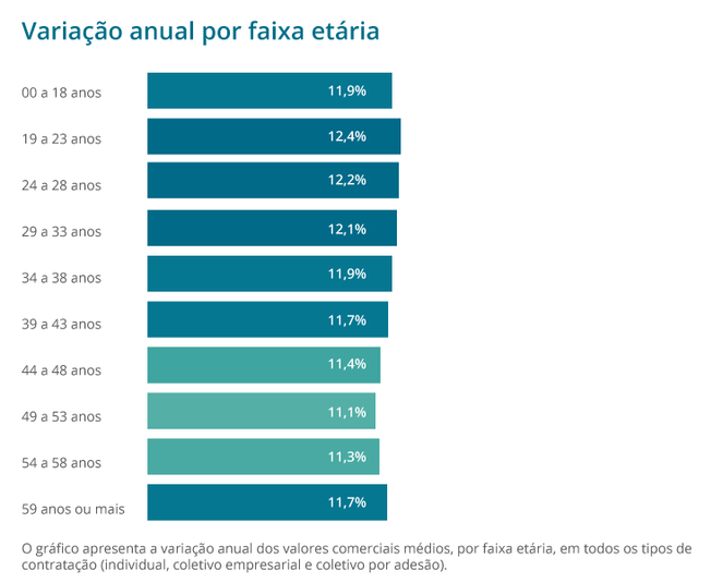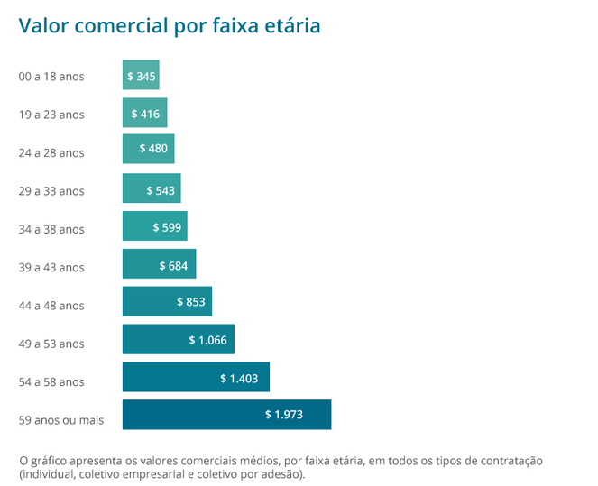 Quanto ao valor comercial médio por faixa etária, observa-se que, para a faixa de 0 a 18 anos de idade, o valor comercial médio atingiu R$ 345, representando uma variação de 11,9% frente ao ano anterior. Para a última faixa etária, o valor comercial médio foi de R$ 1.973, ou seja, 11,7% superior ao valor registrado em dezembro de 2022. Os valores compreendem os três tipos de contratação (individual, coletivo empresarial e coletivo por adesão).