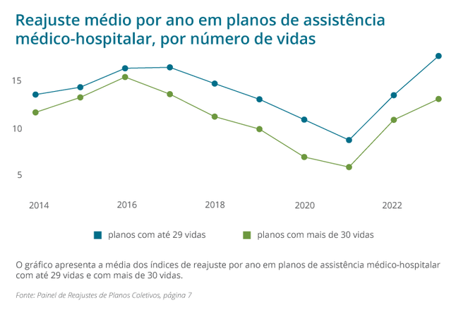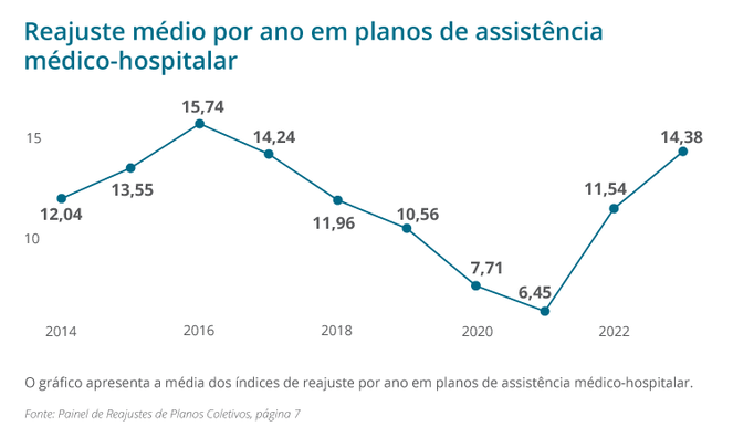O reajuste médio aplicado aos contratos coletivos de assistência médico-hospitalar de janeiro a novembro de 2023 foi de 14,38%, ou 2,8 pontos percentuais acima do reajuste médio observado nos doze meses de 2022. O aumento nos reajustes coletivos em 2023 segue na esteira do aumento de sinistralidade observado nos resultados financeiros das operadoras no mesmo período.