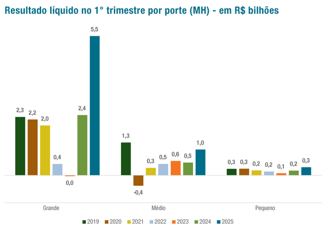 No gráfico acima, é possível observar que o resultado líquido do setor no 1° trimestre de 2025 é o maior da série histórica, desde 2018.