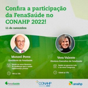 Já a diretora-executiva da FenaSaúde, Vera Valente, participa do painel ‘’Saúde no governo Lula e no novo Congresso’’, às 15h40, e que contará com moderação de Antônio Britto, diretor-executivo da Anahp. O debate também contará com a presença de: Fernando Silveira, diretor Executivo da Abimed; Francisco Balestrin, presidente do Sindhosp; Franco Pallamolla, presidente da Abimo; Henrique Neves, vice-presidente do Conselho de Administração da Anahp e diretor geral do Hospital Israelita Albert Einstein; Marco Aurélio Ferreira, diretor de Relações Institucionais da Anahp. O painel contará também com participação dos deputados federais Antônio Brito (PSD/BA); Beto Preto (PSD/PR); Daniel Soranz (PSD/RJ); Lui Antônio Teixeira (Luizinho (PP/ RJ); e Pedro Westphalen PP/RS.