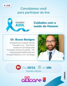 Certa de que a prevenção é o melhor caminho para evitar essa e outras doenças, a AllCare realiza, nesta quinta-feira, dia 25, às 19h, a live Cuidados com a Saúde do Homem. Para falar sobre esse tema de grande importância, convidamos o Dr. Bruno Benigno, Urologista do Hospital Alemão Oswaldo Cruz, em São Paulo.