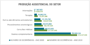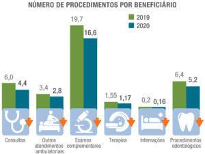 As consultas médicas em geral apresentaram redução de 25,1% em 2020 em comparação com 2019, passando de 6 consultas anuais para 4,4 por beneficiário. As terapias diminuíram 23,7% e as internações hospitalares tiveram queda de 14,7%. De acordo com o DATASUS, as reduções no Sistema Único de Saúde (SUS) para consultas e internações foram de respectivamente 25% e 16%.