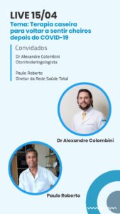 Com objetivo de compartilhar informações sobre saúde e qualidade de vida, a Rede Saúde Total inicia um ciclo com um Talk Show, onde vai trazer diversos convidados, para falar sobre diversos assuntos ligados ao bem estar. A primeira transmissão acontece no dia 15 de abril, às 19 horas, com o tema “Terapia caseira para voltar a sentir cheiros depois da Covid-19”. O programa será apresentado por um dos gestores da Rede Saúde Total, Paulo Ribeiro, que recebe o otorrinolaringologista, Dr. Alexandre Colombini. Para assistir o Talk Show, é só acessar o @redesaudetotal, no Instagram