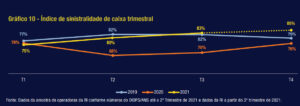 Ainda segundo a ANS, a sinistralidade no 3º Tri de 2021 ficou em 83%, oito pontos percentuais maior que no primeiro trimestre do ano, que foi de 75%. Considerada a projeção feita pela agência reguladora, o quarto trimestre é ainda mais preocupante: as operadoras podem encerrar 2021 com 85% de sinistralidade, dez pontos percentuais a mais que o apresentado no começo do ano.