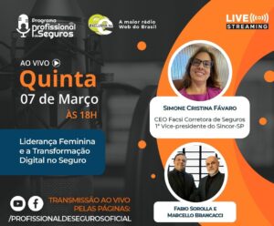Com base nesse cenário, e como em março se comemora o Dia Internacional da Mulher, o programa Profissional de Seguros entrevistará diversas executivas durante este mês. A primeira delas será Simone Cristina Fávaro, vice-presidente do Sincor-SP e CEO da Facsi Corretora de Seguros. Ela atua no mercado de seguros há quase 28 anos.
