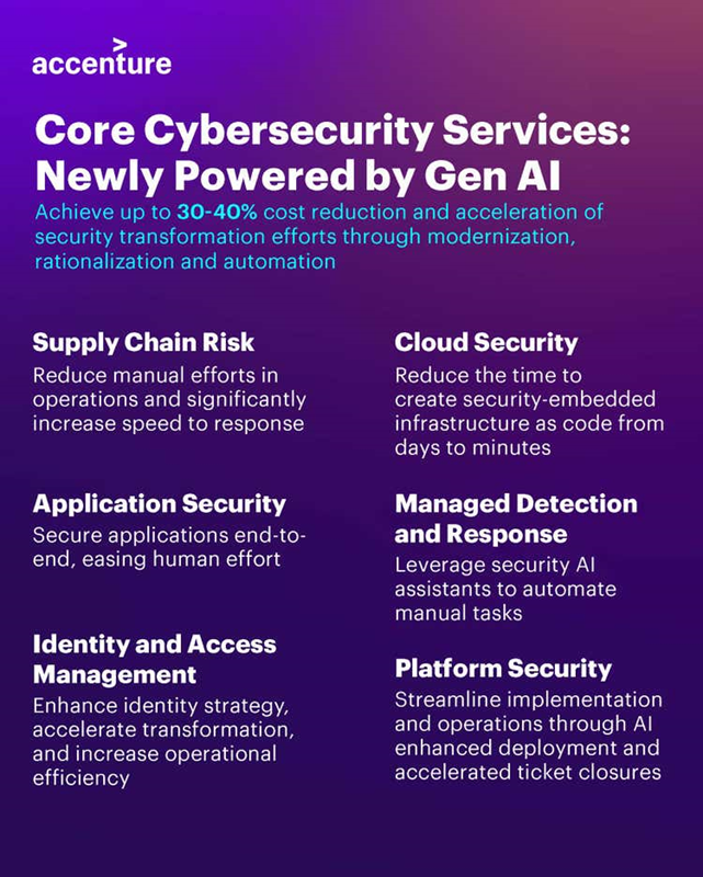 Por exemplo, a Accenture está trabalhando ativamente para proteger nações de ataques cibernéticos e está ajudando a Agência Central de Tecnologia da Informação do Governo do Kuwait a fortalecer sua infraestrutura de segurança cibernética por meio do estabelecimento e gerenciamento de um Centro Nacional de Operações de Segurança. Este esforço colaborativo visa aumentar a visibilidade, detecção e recursos de remediação contra ameaças cibernéticas em evolução. O projeto será apoiado pela rede global de Cyber Future Centers da Accenture, com uma equipe local 24 horas por dia, 7 dias por semana, focada em proteger as organizações mais críticas do país, alavancando os benefícios da IA de geração.