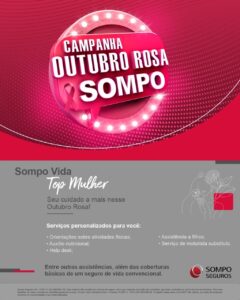 A Sompo Seguros S.A., empresa do Grupo Sompo Holdings – um dos maiores grupos seguradores do mundo, acaba de lançar a Campanha Outubro Rosa Sompo, por meio da qual vai incrementar os ganhos dos corretores de seguros na venda do Seguro Sompo Vida Top Mulher, seguro de vida individual que traz coberturas, benefícios e serviços especialmente desenvolvidos para atender ao público feminino. A iniciativa integra as ações em comemoração ao Outubro Rosa, mês em que são desenvolvidas atividades para chamar a atenção da sociedade sobre a importância do diagnóstico precoce do câncer de mama.